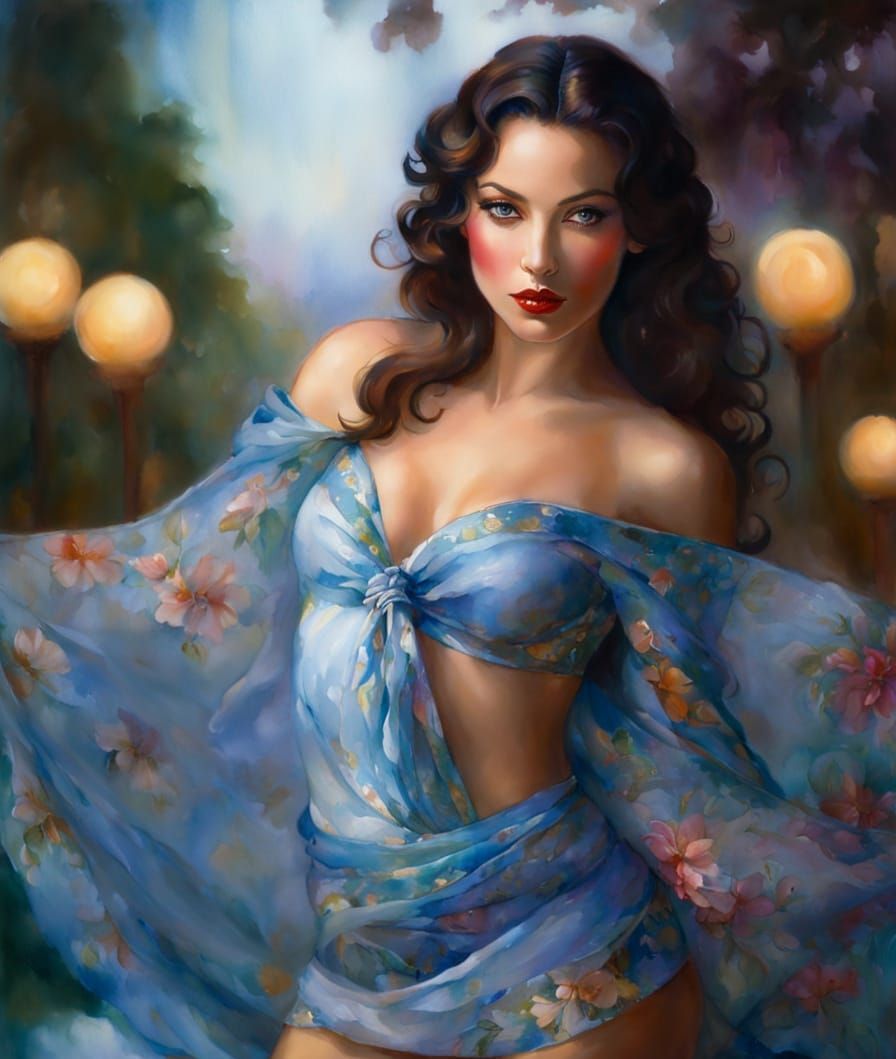 This image shows a pin-up style portrait of a pale-skinned Aphrodite against a floral backdrop. The artwork uses a vibrant watercolor wash with elegant golden light, in a dreamy romantic style.