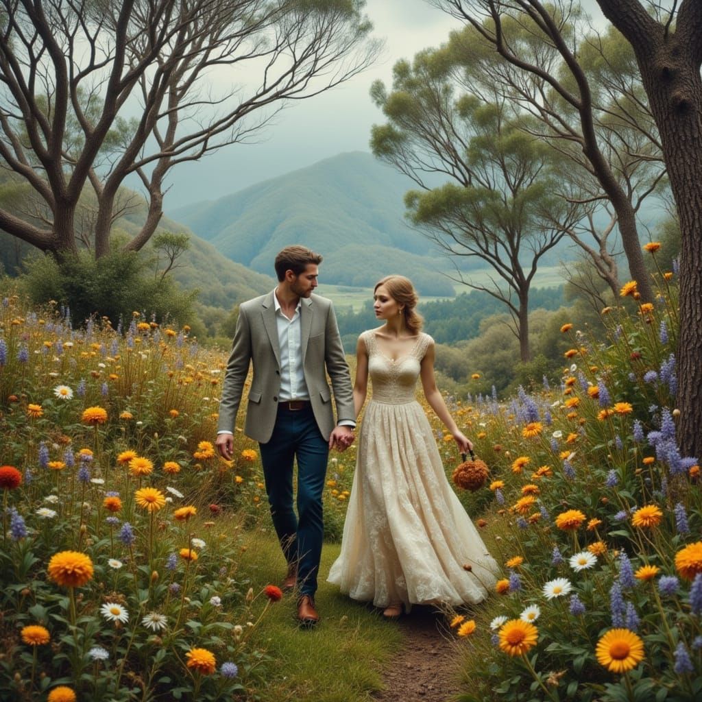 marionette fantasy oil painting <lora:Marionette-Flux:1.0> of a man who represents Ai and his wife who represents Organic Intelligence walking in <lora:Detailed realism:1.0> <lora:Nature Portraits:1.0> harmony in the country of New Zealand with nature and wildlife moving to the flow of their shared love ...