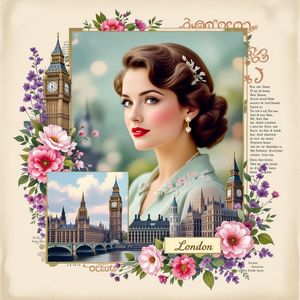 This image shows a woman in a nostalgia-style photo montage reminiscent of a designer scrapbooking kit. The soft focus and luminous palette evoke a sense of historical illustration.