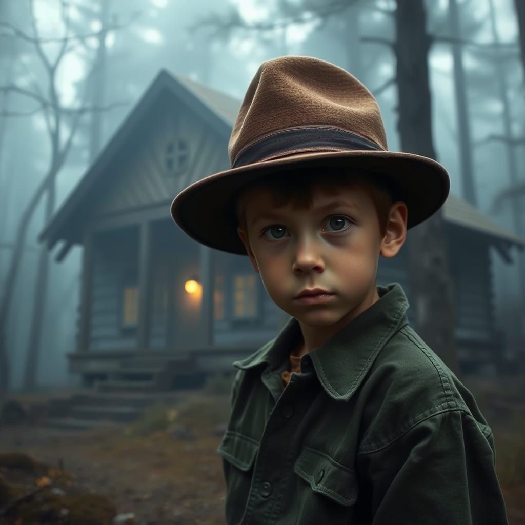 This image depicts a contemplative boy in a brown hat and green shirt near a cabin in a misty forest, evoking an eerie, mysterious atmosphere with dark romanticism and earthy tones.