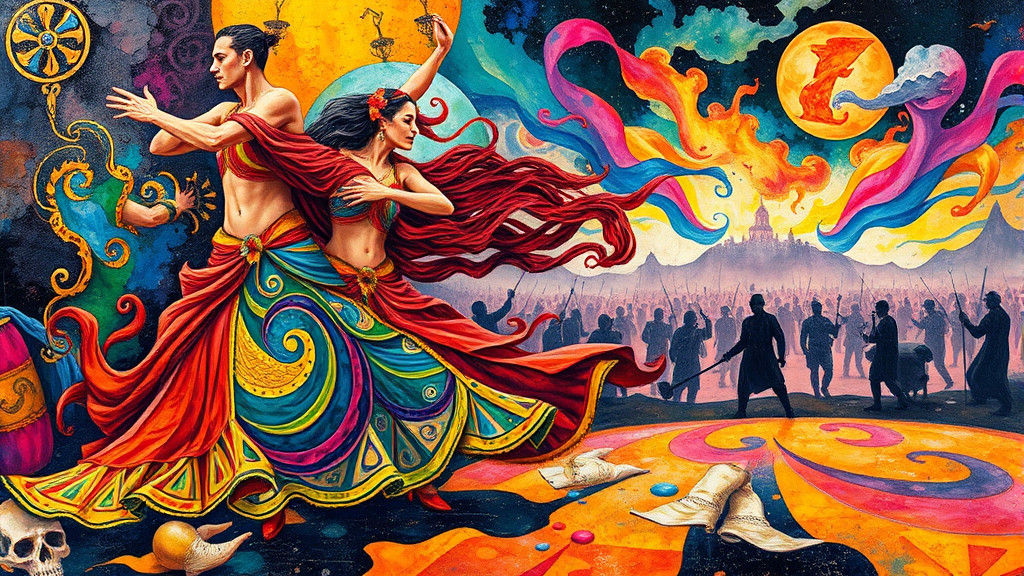 This image shows energetic samba dancers in motion against an abstract background. The artwork features intricate Celtic patterns, trompe l'oeil effects, a watercolor war scene, and a fluorescent impasto style.