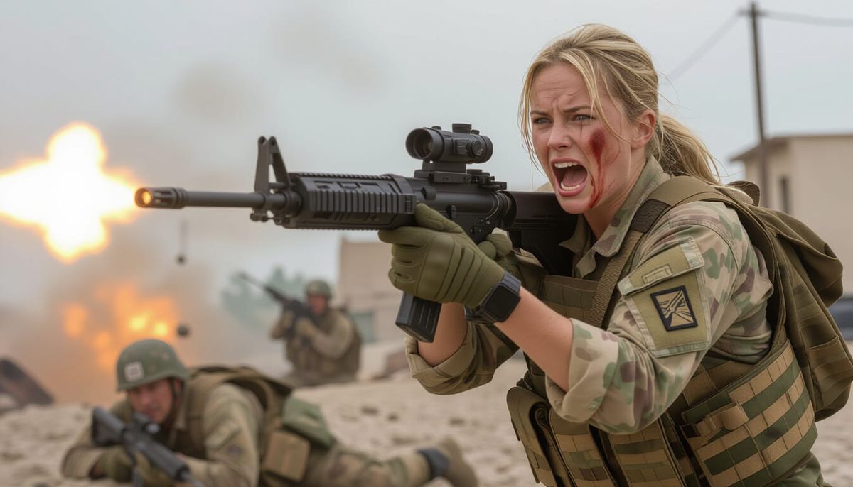 This image depicts a blonde female soldier in camo attire, firing a rifle amidst a war zone. Explosions and devastation surround her, with cinematic effects reminiscent of war films.