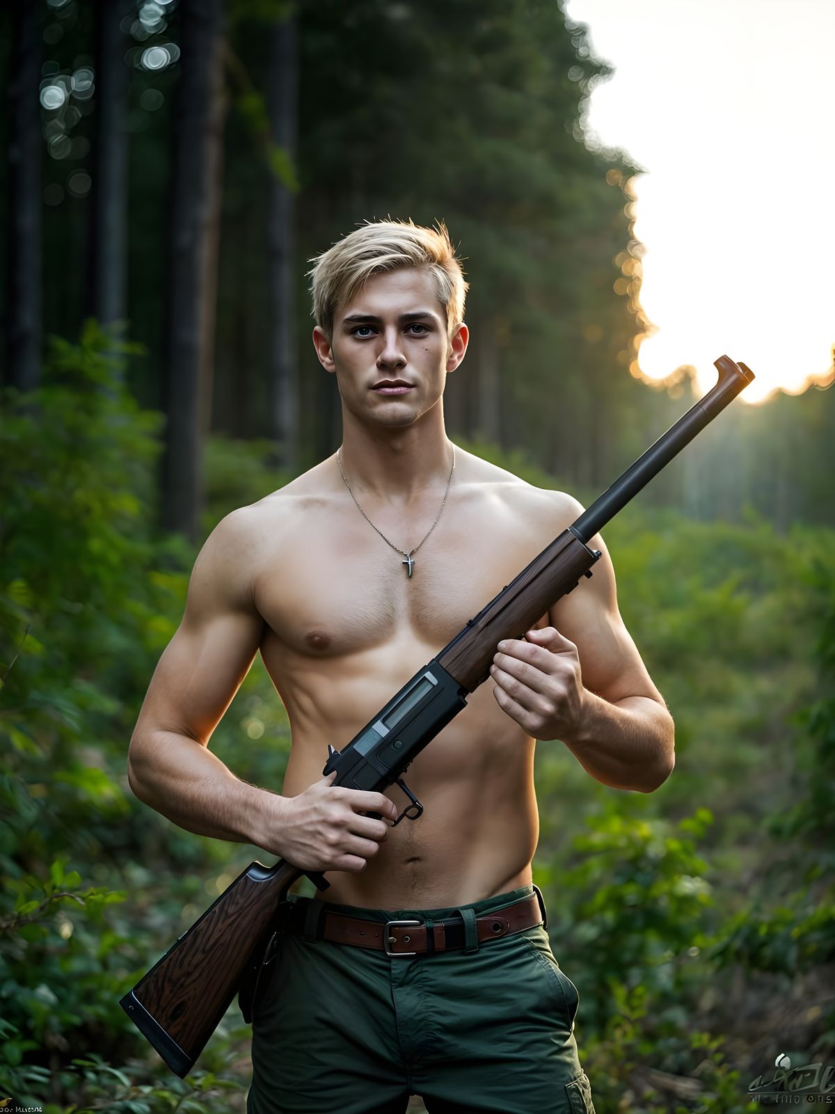 A handsome young hunter stands tall in a forest clearing at sunset, holding a rifle with confidence and poise, surrounded by natural beauty and warm light.