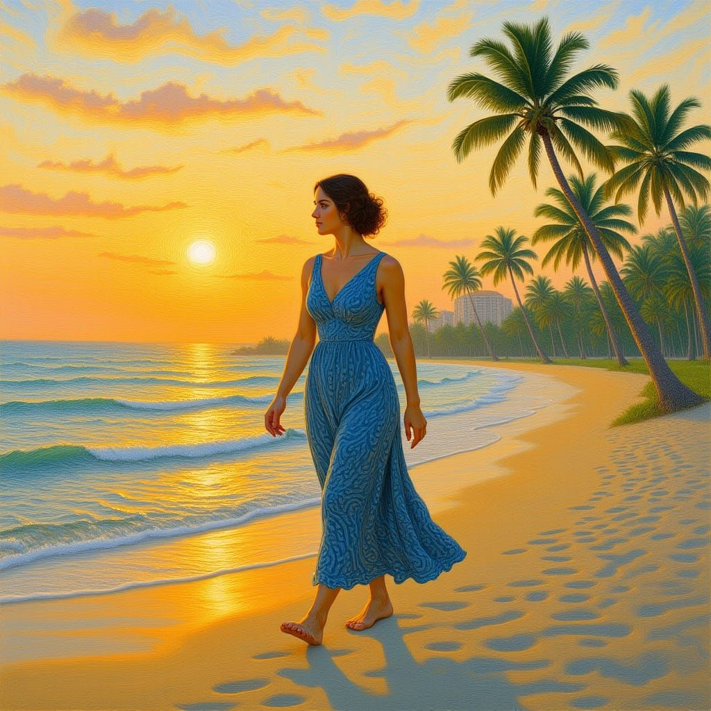 A beautiful woman strolls along a tranquil beach as the sun sets. The scene is painted with soft brushstrokes and warm colors, reminiscent of impressionist art.