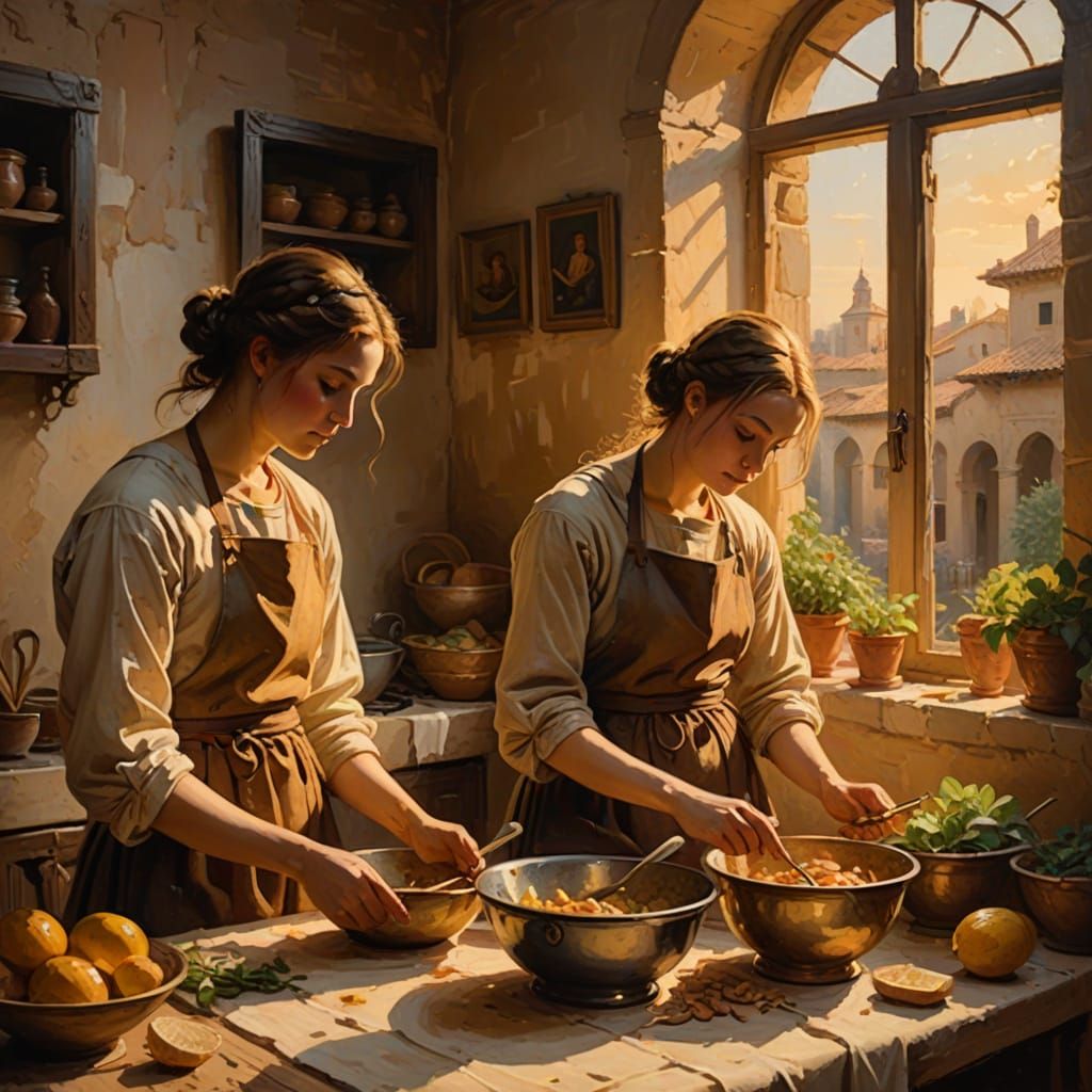 This painting depicts young girls preparing a meal in a warm, cozy room. The scene features soft brushstrokes, earthy tones, and gentle shadows, creating a realistic and detailed atmosphere.