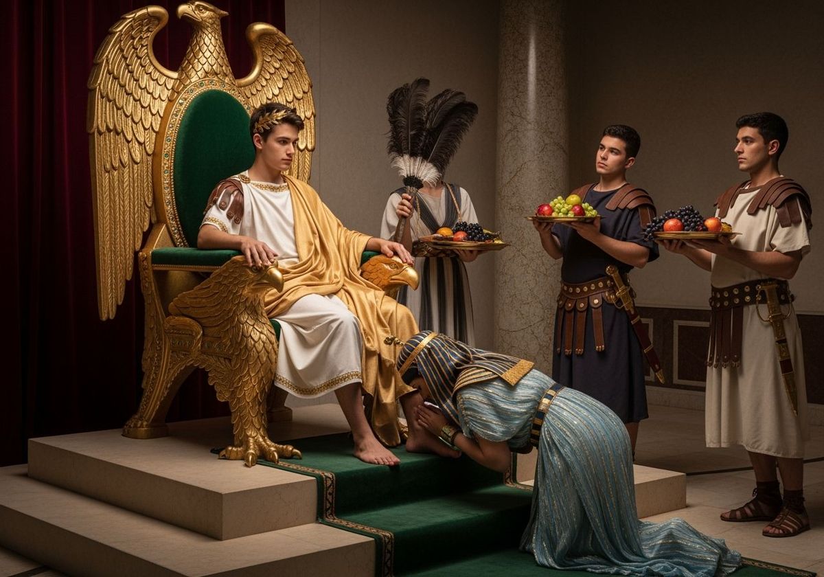 This image shows a young Roman Emperor on an eagle throne receiving the Queen of Egypt. The scene, reminiscent of Baroque paintings, is richly detailed with gold, emeralds, and lavish fabrics. The composition features shallow depth of field.