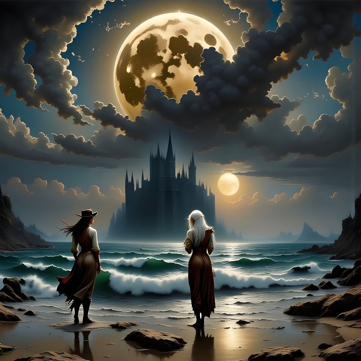 This image shows two women in Old West attire watching a full moon over the ocean at night. A distant castle adds to the mysterious atmosphere.