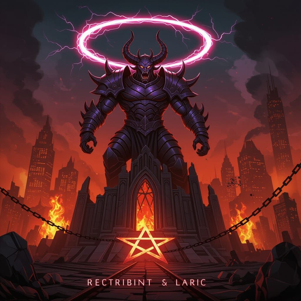 Illustration of a demon lord in cracked obsidian armor, triumphant atop a digital cathedral. Features electric crimson lightning, molten chrome, and a fire-choked cityscape with neon hues.