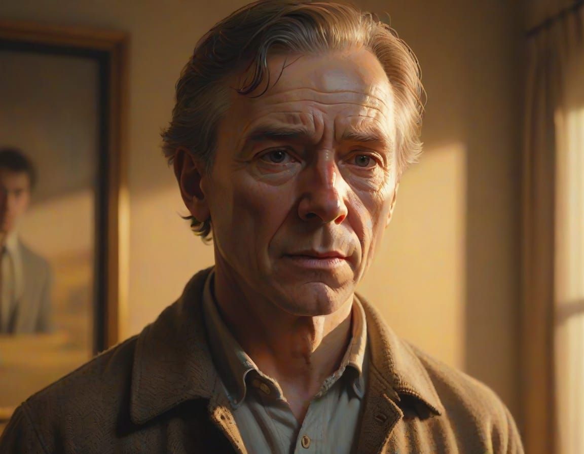 A medium shot portrait of Edmondson in a dimly lit room, painted in oils. The warm lighting and soft brushstrokes create a realistic and expressive image with subtle textures.