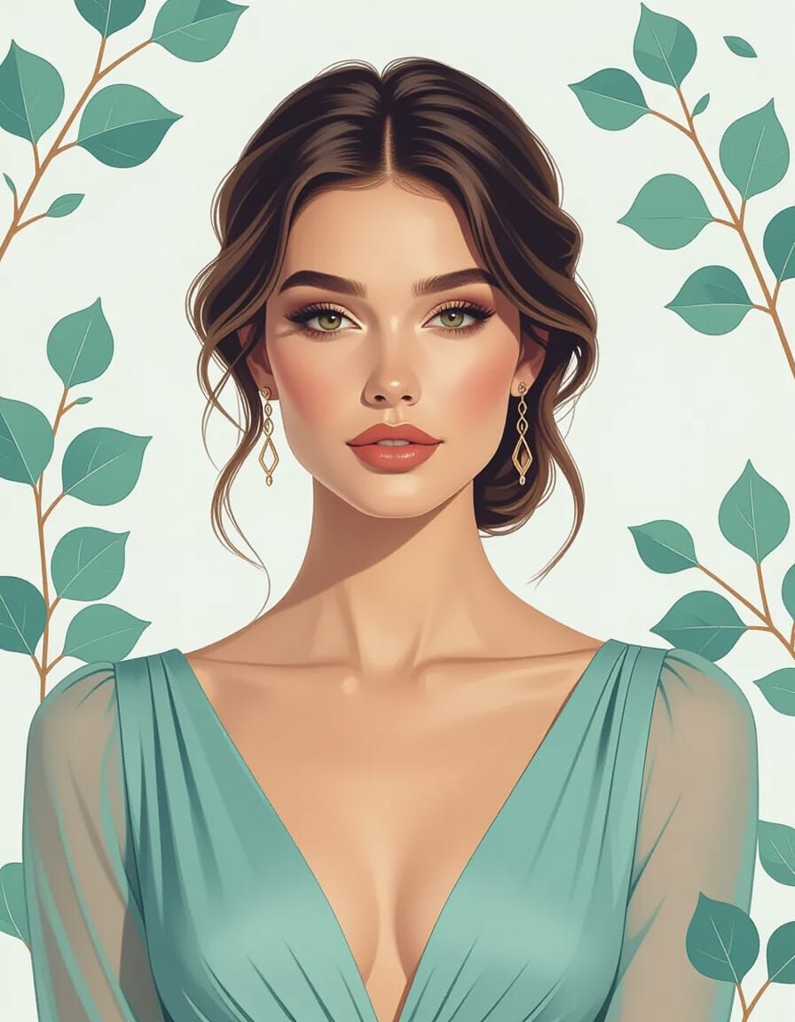This image shows a head and shoulders portrait of a woman in elegant clothing. The background features a seamless watercolor pattern of eucalyptus leaves in dusty blue and muted green tones. The artwork has dynamic lighting and triadic colors.