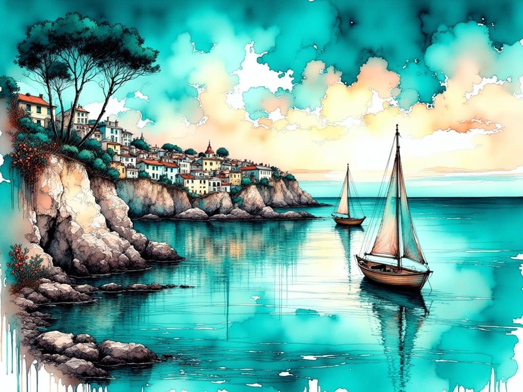 A vintage image of a Mediterranean city and seascape bathed in turquoise light at sunset. The monochromatic painting features fine details, crosshatching, and iridescent bokeh.