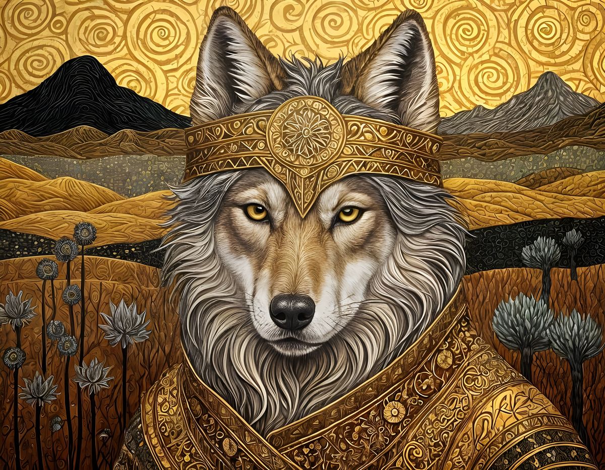 A striking picture of an anthropomorphic wolf wearing a sombrero in a desert at twilight. The image is rendered in a gilded style with flowing geometric patterns and floral designs.