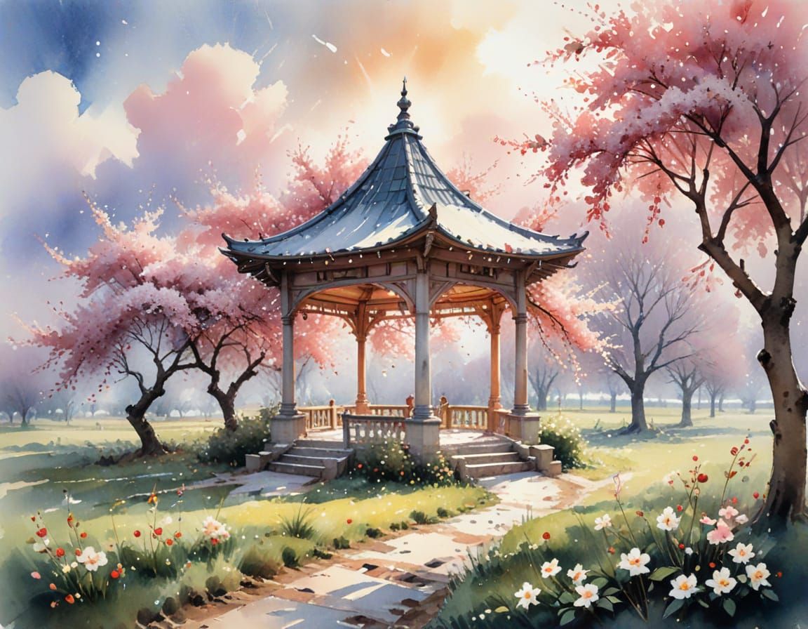 A watercolor painting of a cherry orchard in spring, with petals falling around a tea pavilion. The artwork combines elements of impressionism and surrealism using delicate watercolor techniques.