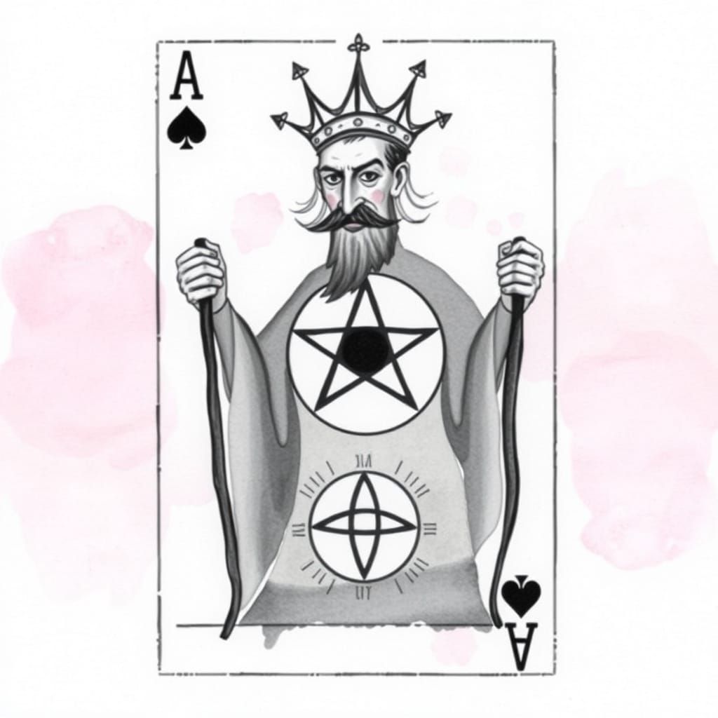 This image shows an Ace of Pentacles tarot card in a surreal monochrome watercolor style. The card's design evokes a dreamlike quality, reminiscent of classic tarot art.