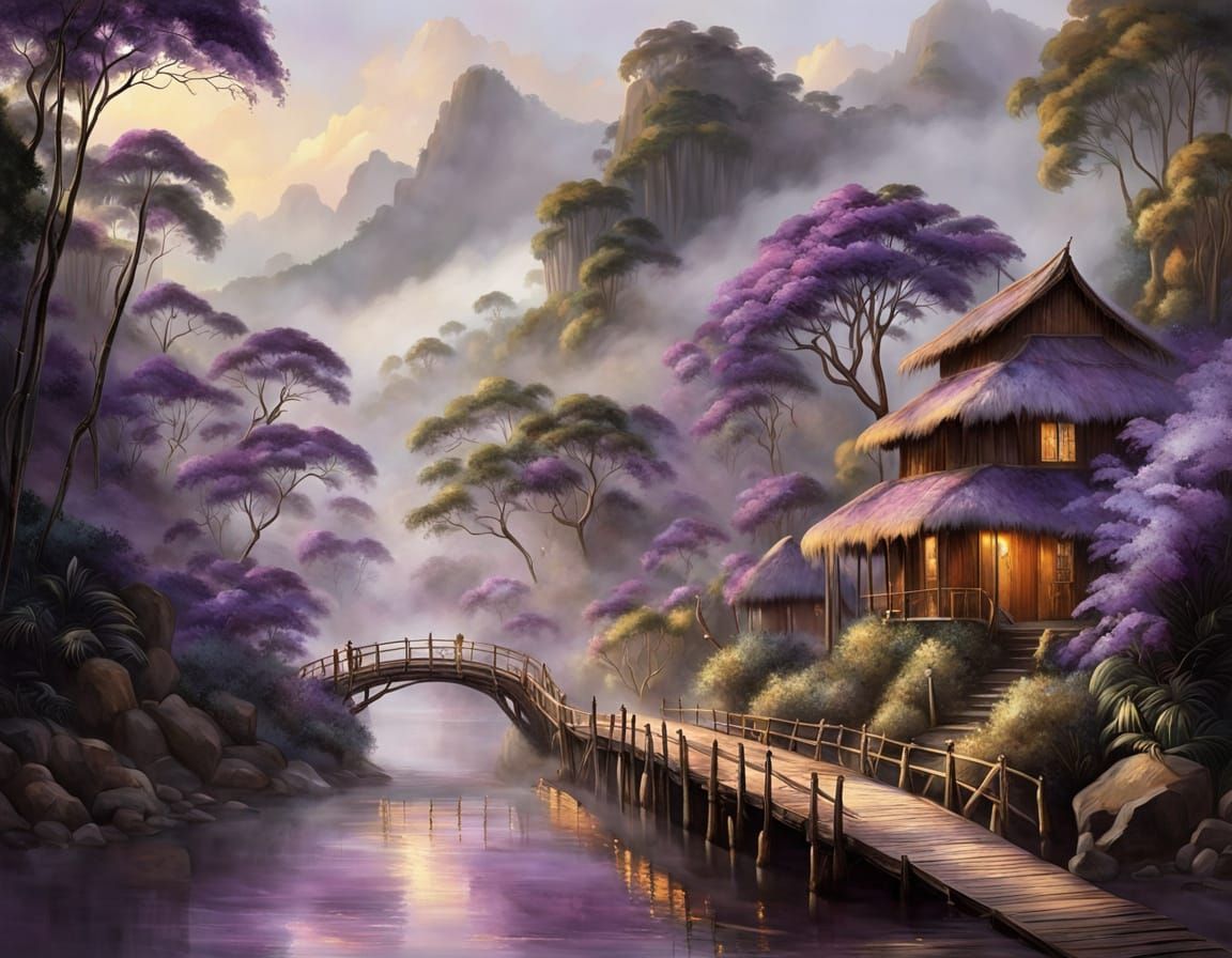 A picturesque riverside town featuring bamboo stilt houses and a vibrant jacaranda tree. The fresco-style image evokes a romantic and bold atmosphere with dramatic lighting.