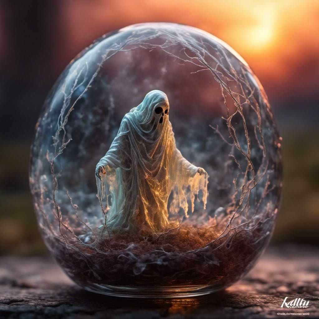 A hyperrealistic miniature ghost inside a cracked glass head with glowing neon cracks. The detailed matte painting features deep colors and intricate details reminiscent of fantasy concept art.