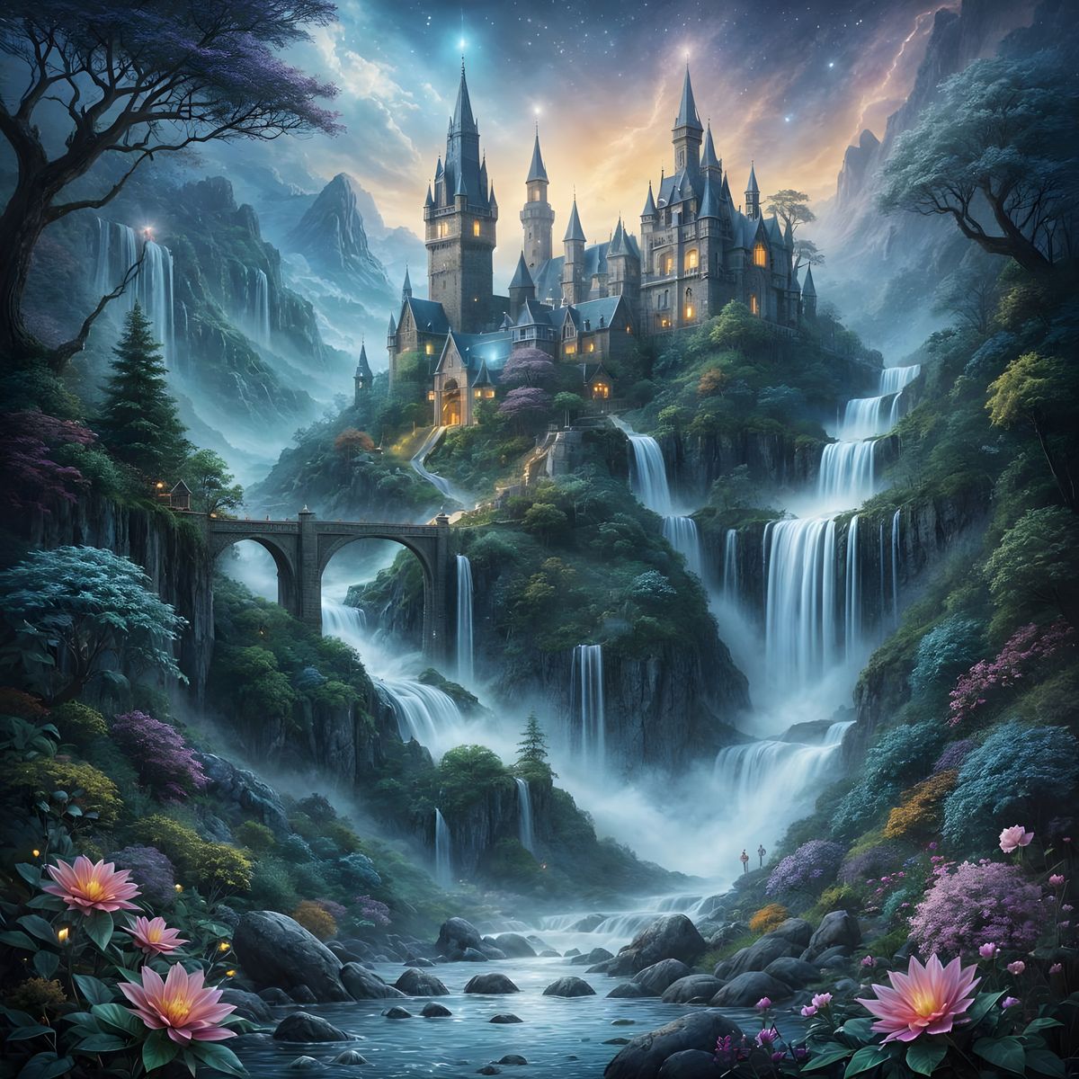 This image shows a fantasy castle nestled near a huge waterfall, glowing with vibrant colors. The scene is dreamlike, with shimmering mist and a mystical aura.