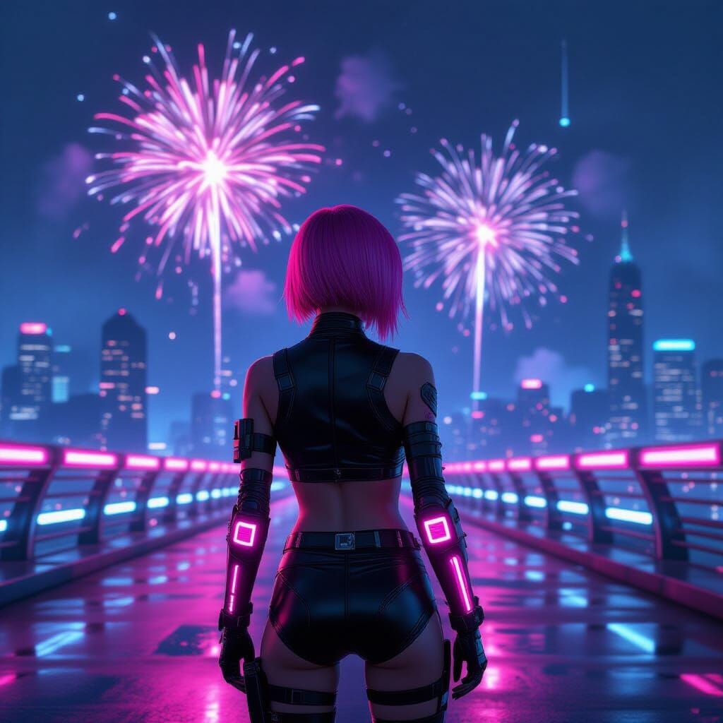 A cyberpunk woman with pink hair stands on a futuristic bridge, watching fireworks over a dystopian city. The image captures a high-tech, neon-lit scene with a Blade Runner aesthetic.