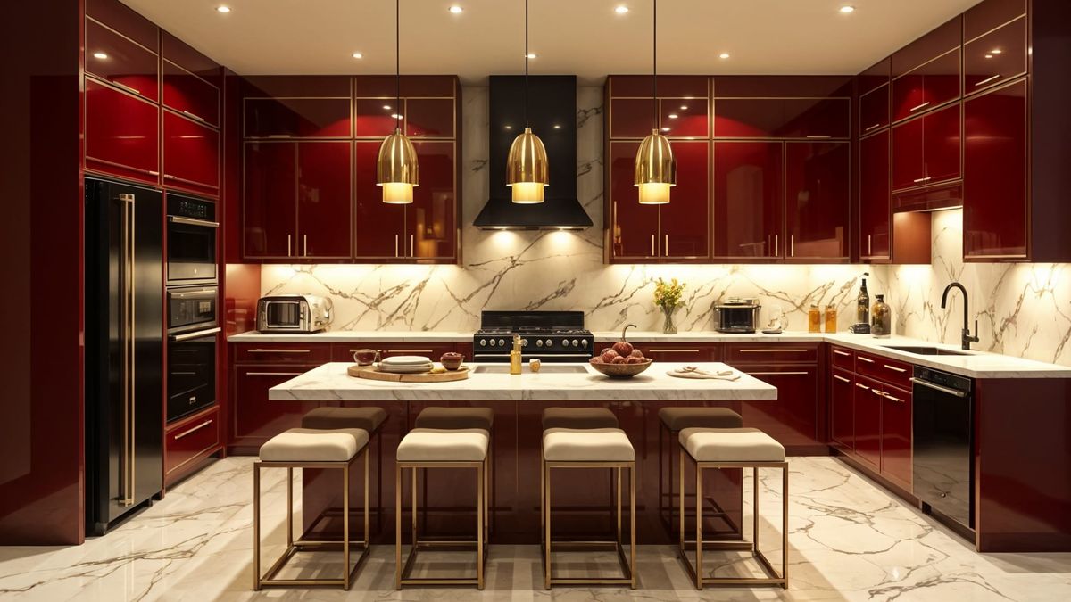 A view of a luxurious Art Deco kitchen interior. It features burgundy high-gloss cabinets, bright marble countertops, a central island, and modern black and gold appliances under warm ambient lighting.