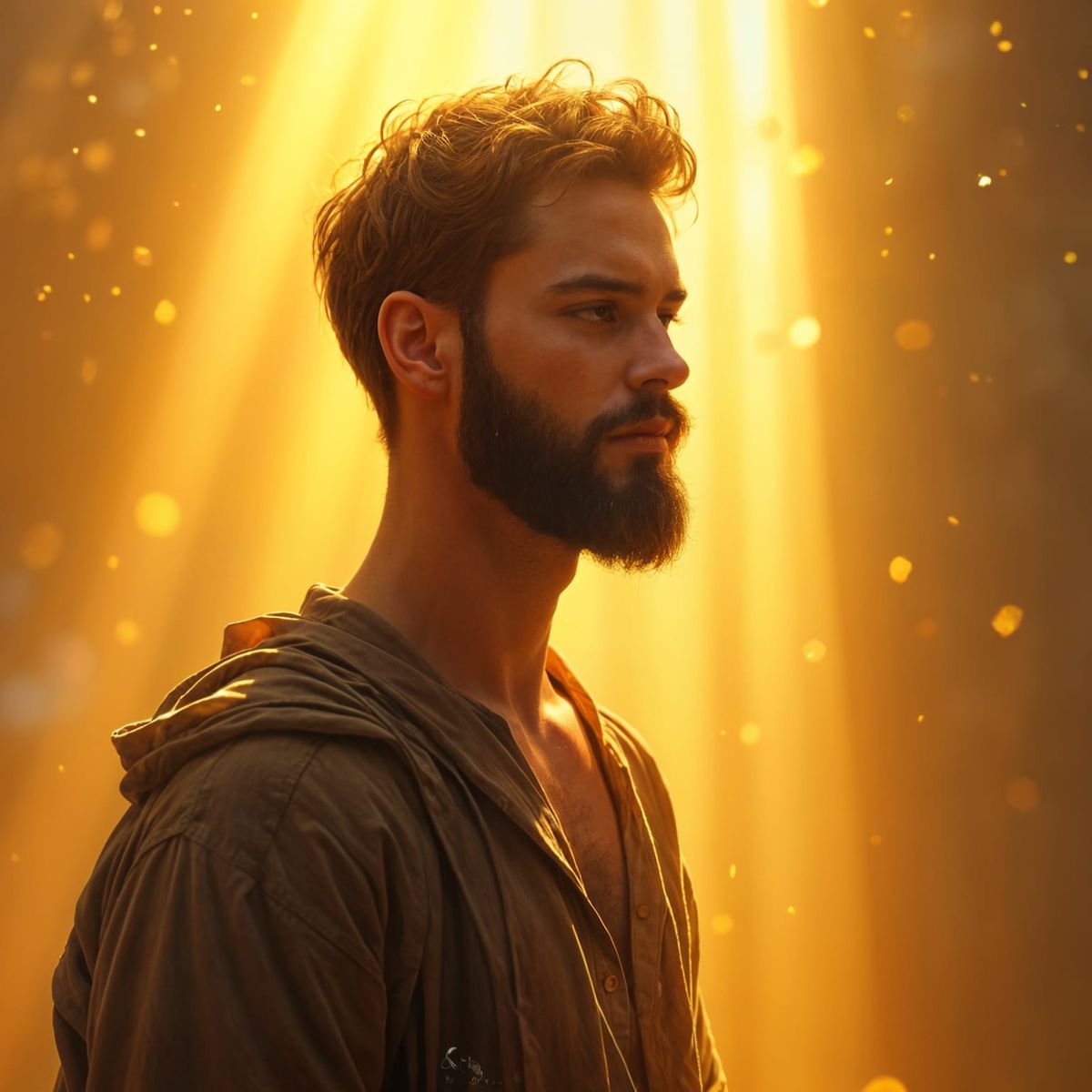 A striking picture of a handsome, bearded young man bathed in golden light. The scene evokes a dreamy, ethereal atmosphere with soft focus and painterly textures in a fantasy style.