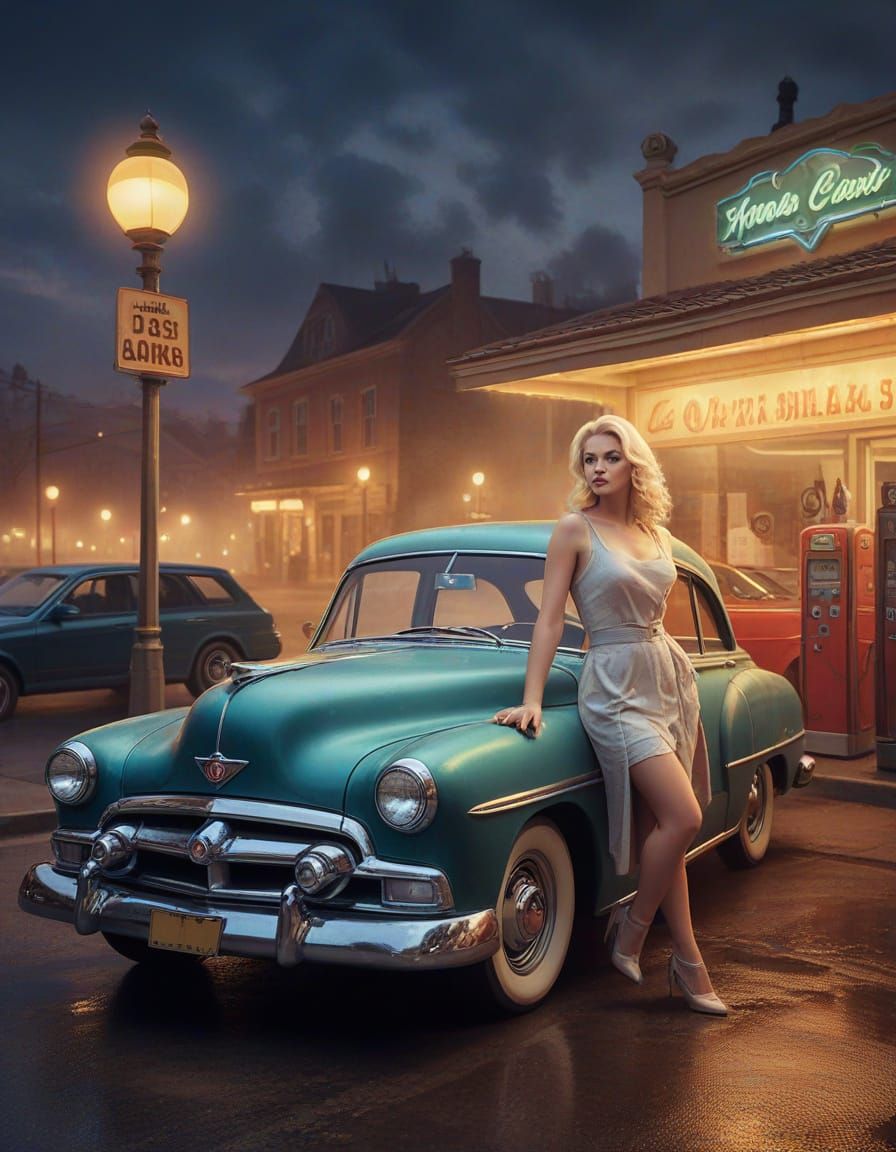 This image shows a vintage poster featuring a blonde pinup girl posing with a classic car at a gas station. The scene is set on a misty night, enhanced by soft golden lighting and ethereal fantasy elements, in a hyperrealistic style.