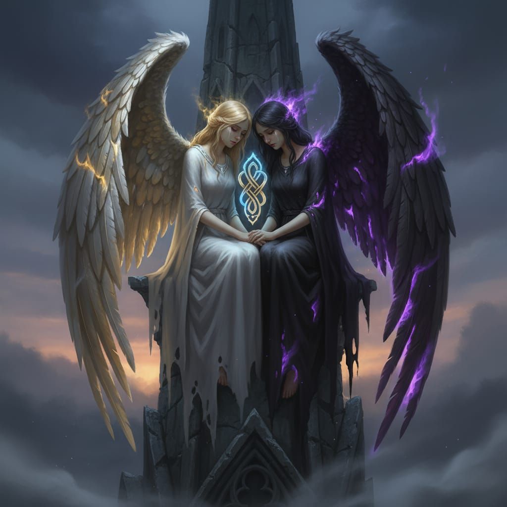 This image depicts a celestial angel with golden wings beside a dark angel wreathed in violet flame, perched on a ruined spire. The scene features dramatic lighting and intricate textures.