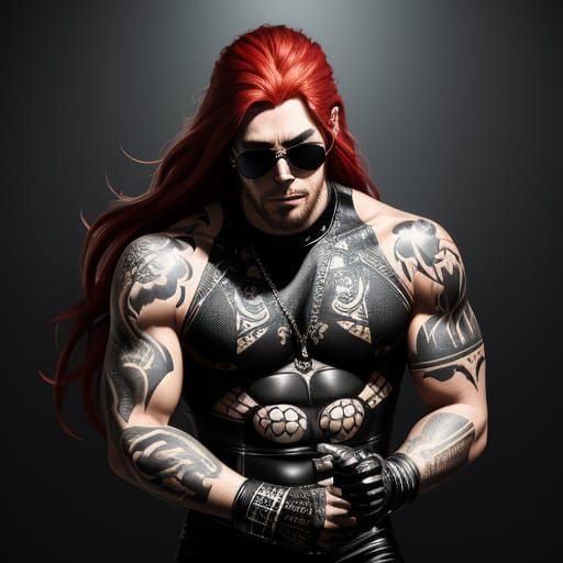 This image is a hyper-realistic close-up of a male action figure with vibrant red hair, intricate tattoos, and reflective sunglasses, set against a worn and weathered resale box backdrop.
