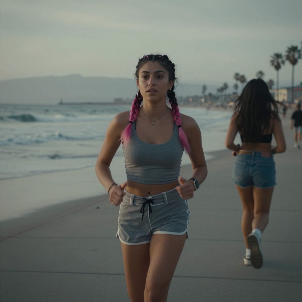 This image shows a young punk girl with braided hair jogging by the water at Venice Beach. Captured in a hyperrealistic, cinematic style with film grain and dramatic lighting.