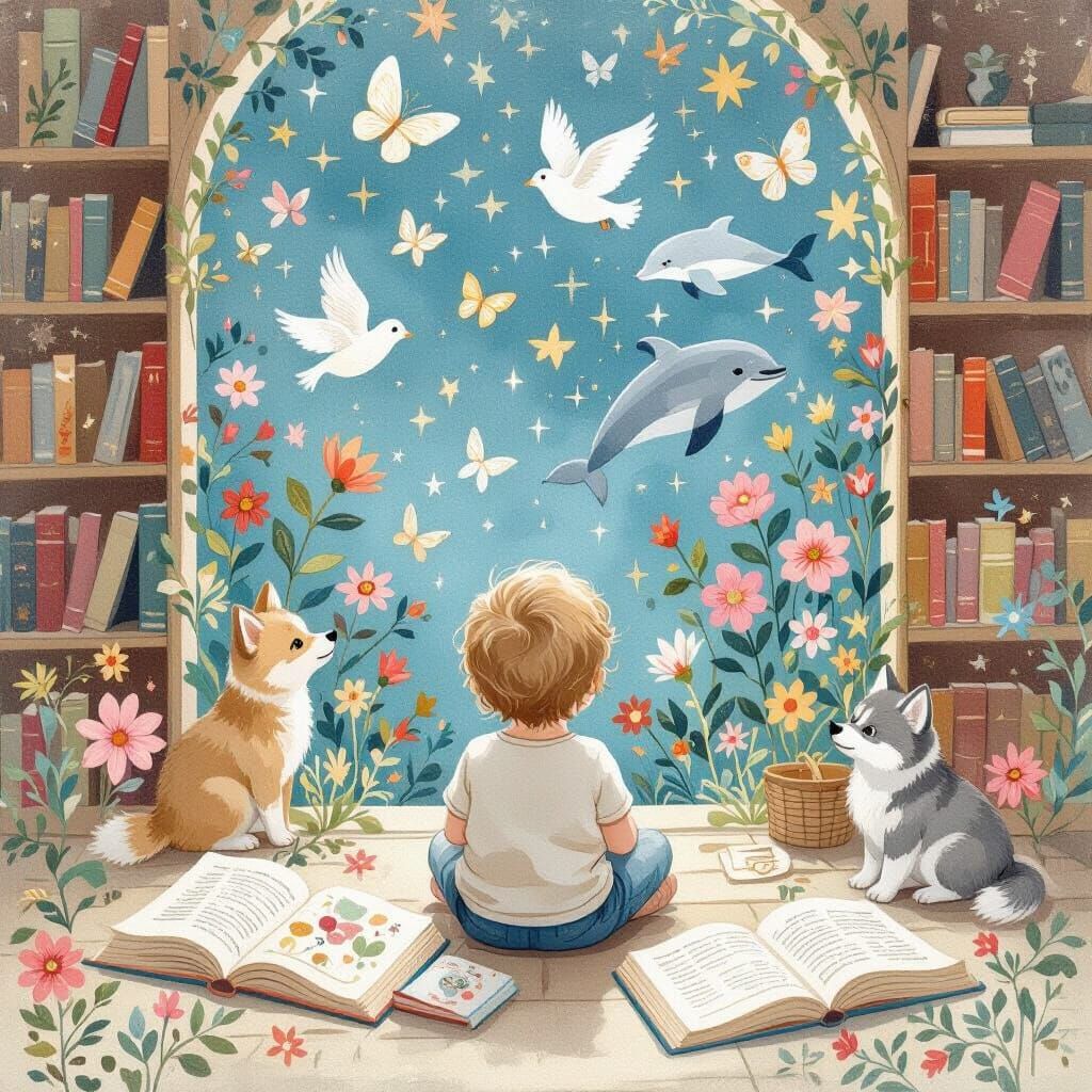 This image shows a toddler in a magical library, surrounded by storybooks. Butterflies, birds, deer, flowers, dolphins, and husky puppies emerge in watercolor style with gold, silver, and pastel colors, reminiscent of fairytale art.