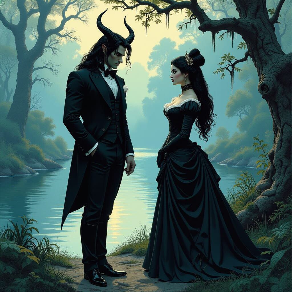 This image shows a striking demon-human hybrid in a tailored suit approaching a Victorian woman by a river in a shaded forest. The image evokes dark fantasy art.