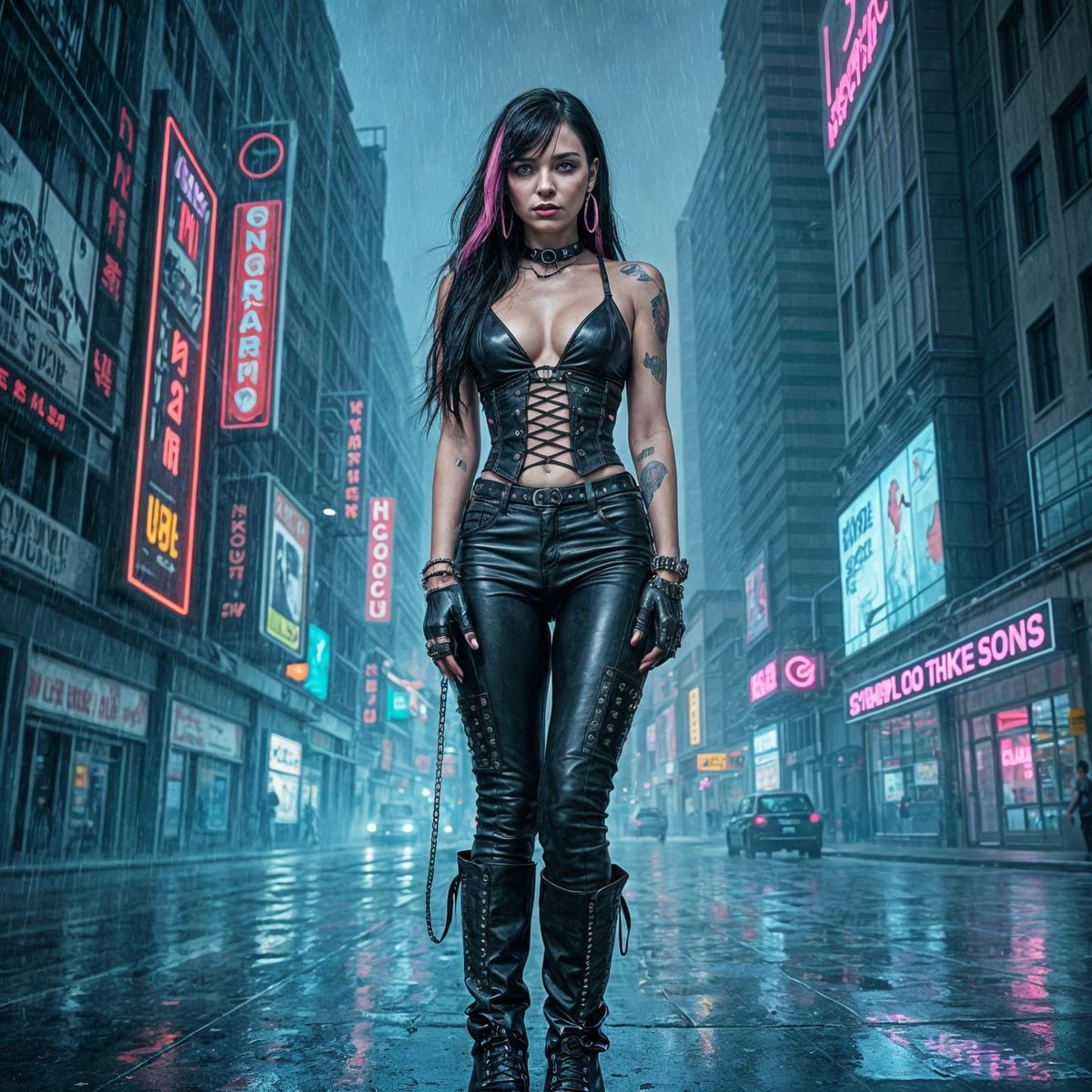 This image shows a striking goth woman standing defiantly in a neon-lit cyberpunk city, amidst a torrential downpour. Her dark, edgy style is reminiscent of a post-apocalyptic film still, with a gritty, cyberpunk aesthetic.