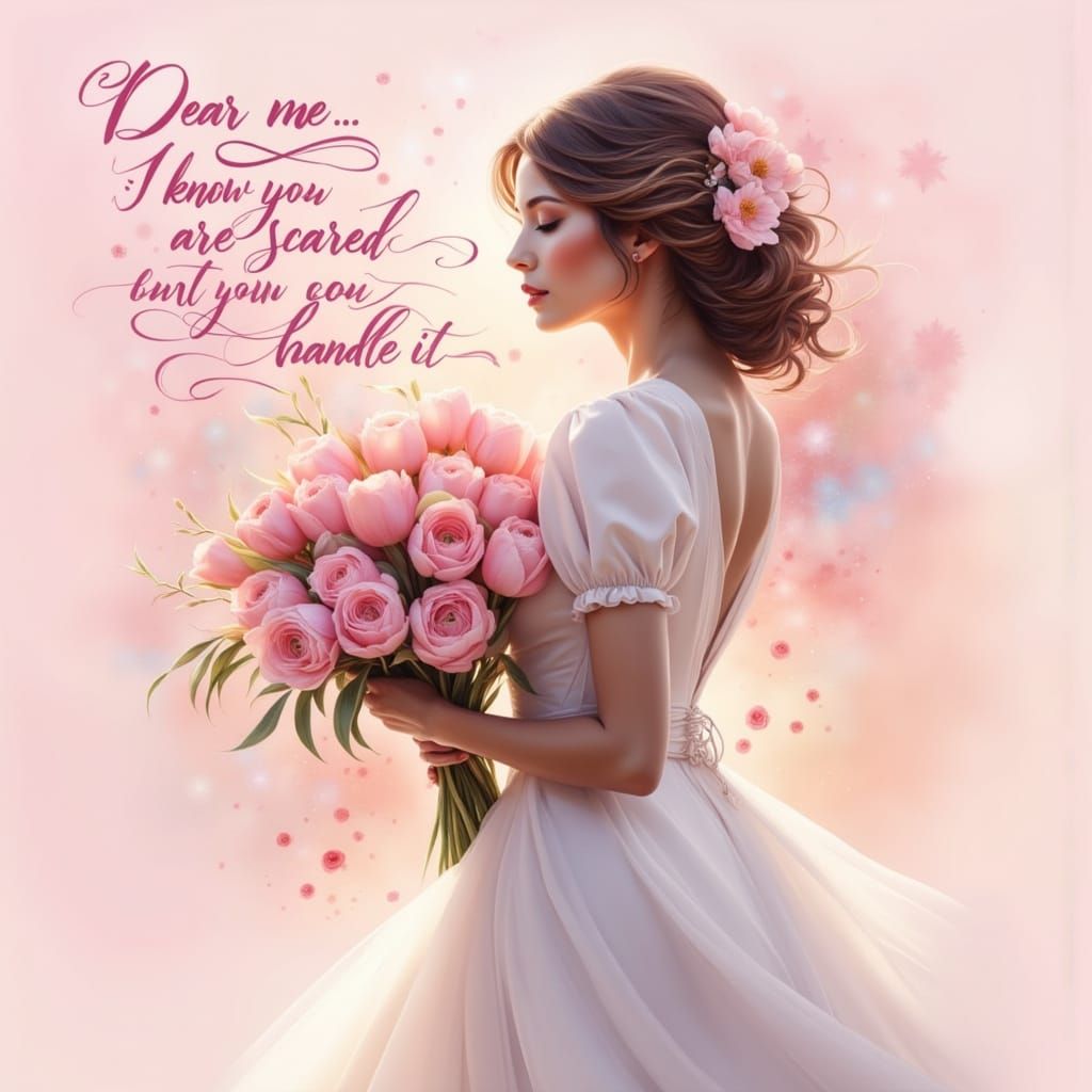 This digital illustration shows a woman from behind holding pink tulips. The art features soft lighting, watercolor bleed edges, and a dreamy pastel palette, evoking reassurance.