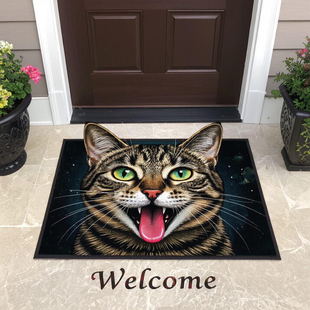 This image shows a bizarre restaurant entrance shaped like a giant cat's mouth with a pink tongue as a welcoming mat. The art blends dark fantasy and playful humor, inspired by surrealist art.