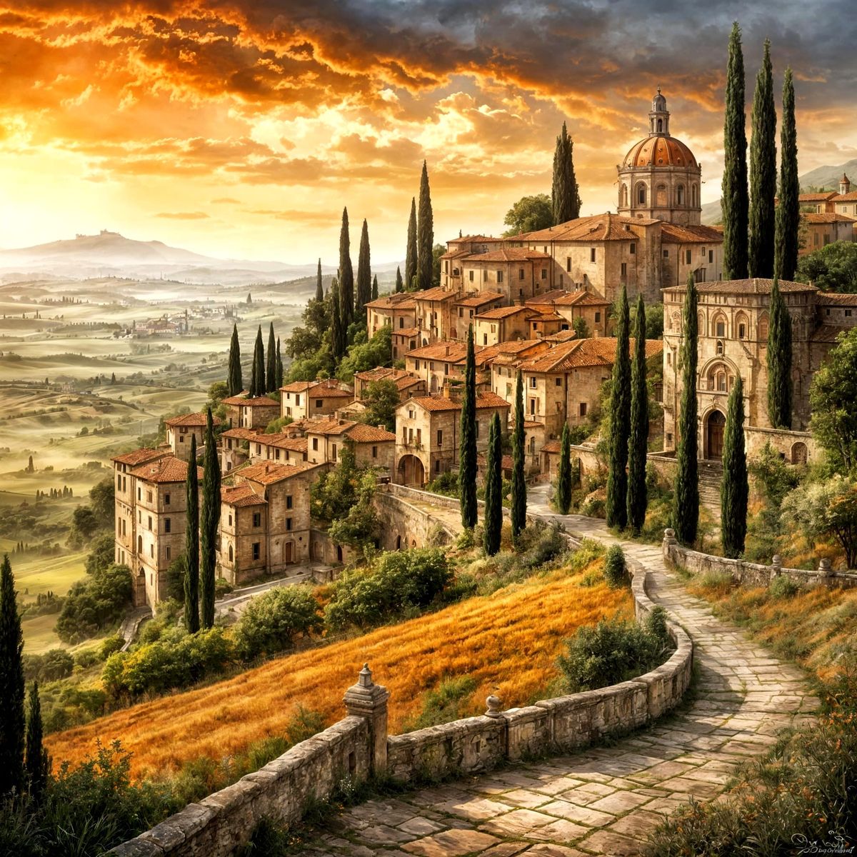 Tuscan Abbey Town at Dawn in Fantasy Style