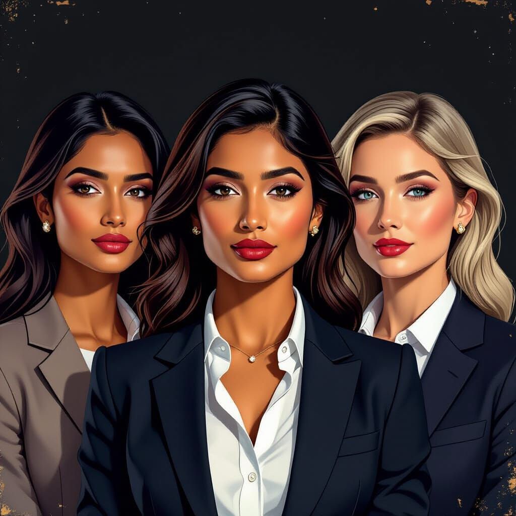 A striking picture of three confident businesswomen in formal attire against a dark background. The close-up portrait blends hyperrealism with comic book aesthetics, using bold lines and vibrant colors.