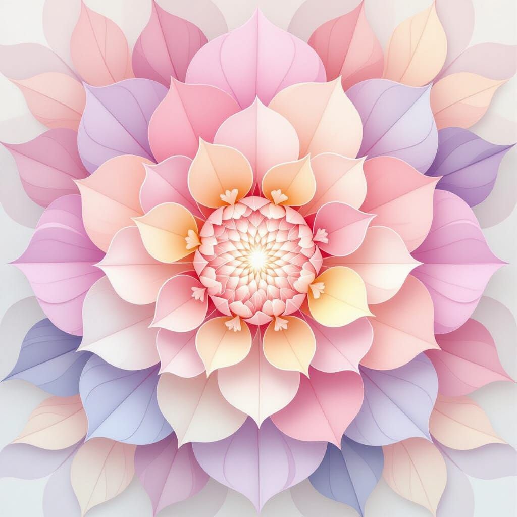 explosive kaleidoscope composition with blooming flower petals radiating outward, roses and peonies and cherry blossoms multiplied in perfect symmetry, soft pastel palette of pink, lavender, peach, and cream, watercolor texture with flowing organic shapes, delicate overlapping layers, ethereal glowing center point, botanical illustration style, dreamy romantic atmosphere