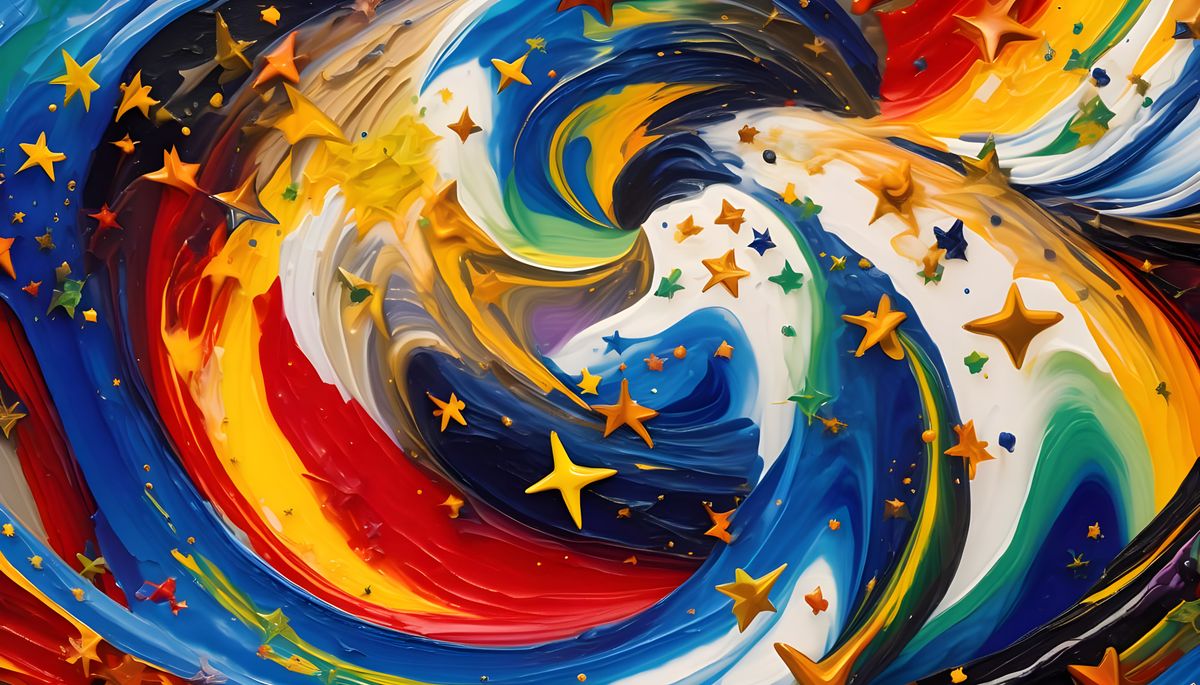 This image showcases a dynamic abstract expressionist composition with swirling vortexes of oil paint and plasma, accented by shimmering, multi-pointed stars in vibrant, luminous opalescent hues.