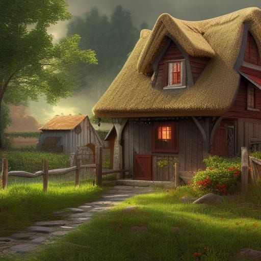 This image shows a quaint cottage nestled on a small farm. The artwork features deep colors and intricate details, creating a fantastical scene reminiscent of fantasy concept art in 8k resolution.