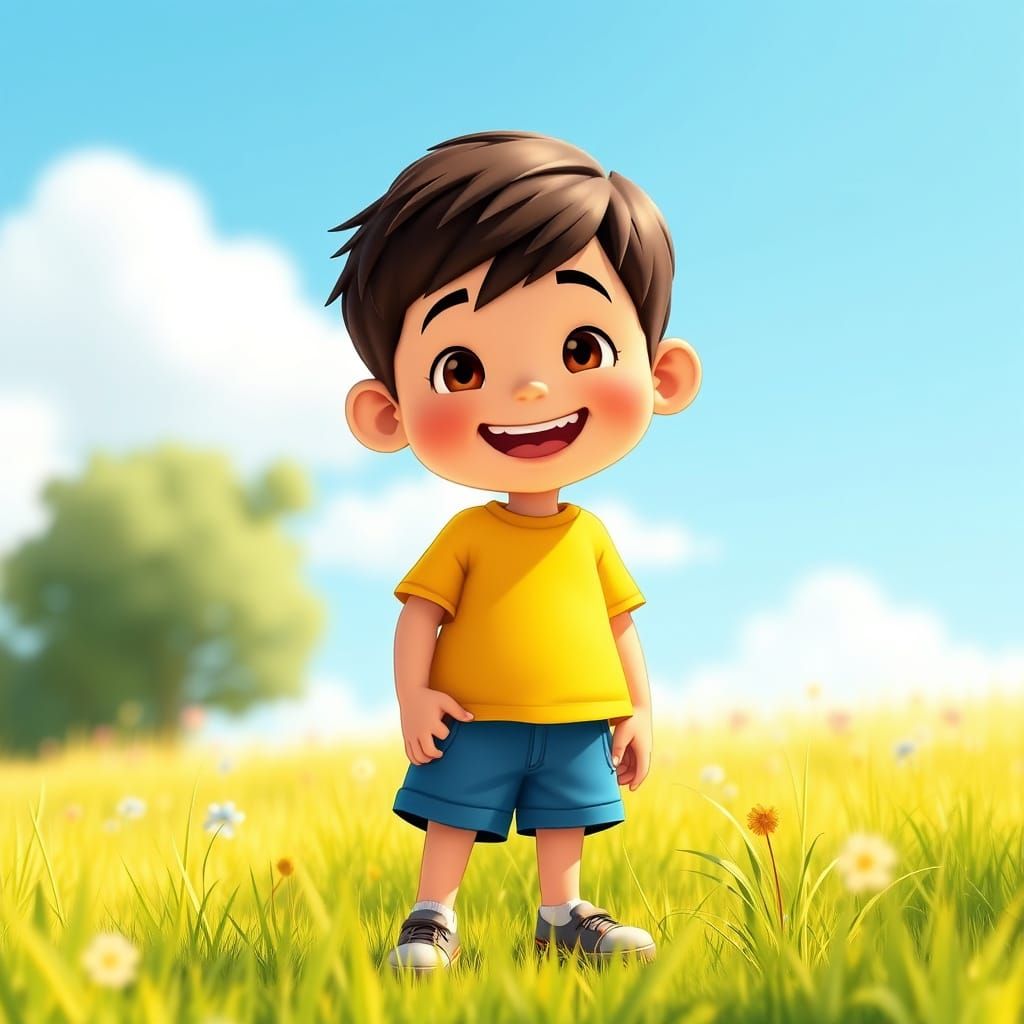 A cheerful cartoon boy stands in a sun-drenched meadow. This vibrant image features exaggerated expressions and a Pixar-inspired anime style.