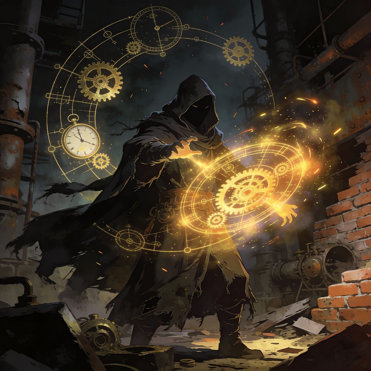 A mysterious mage in a tattered cloak summons glowing golden gears and clock schematics in post-apocalyptic industrial ruins. Digital illustration with volumetric lighting and dramatic depth.