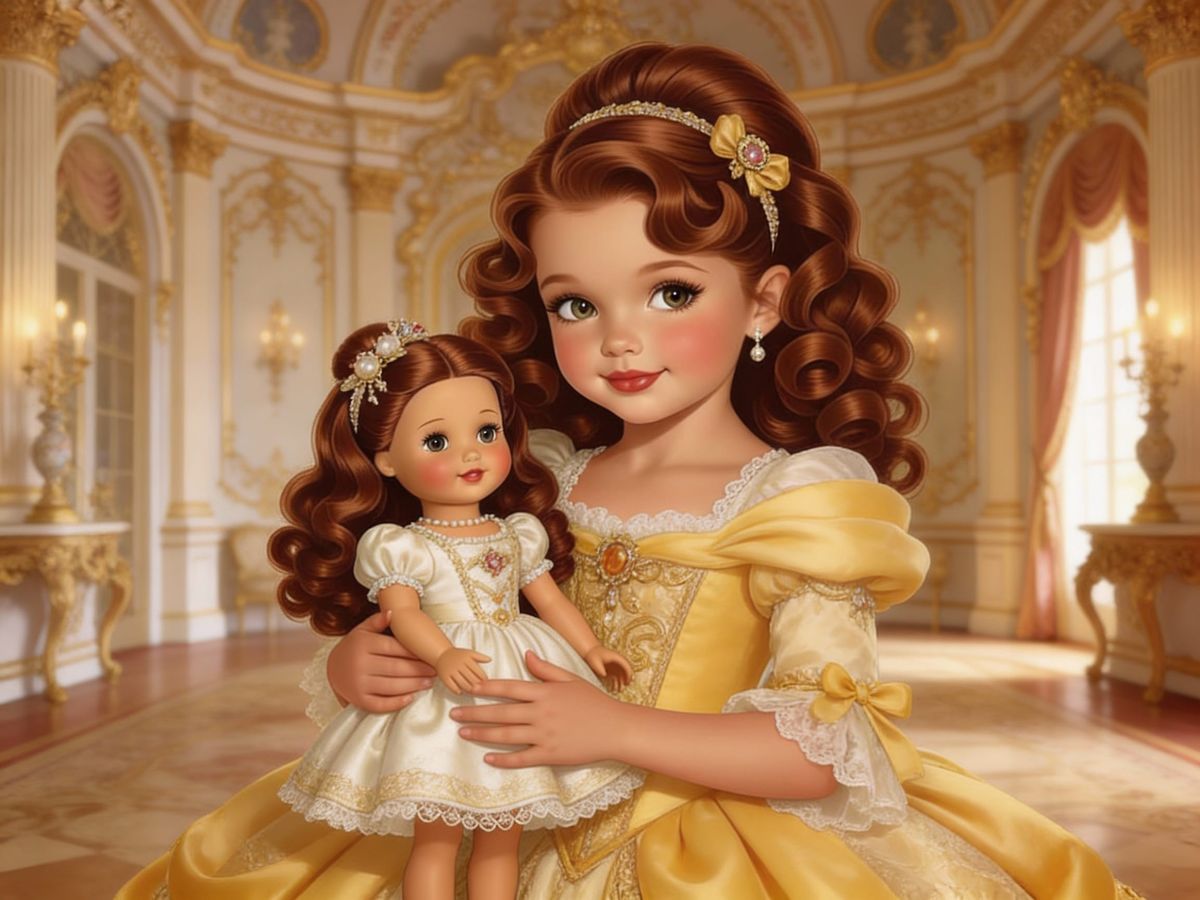 This image features a princess in a lavish Rococo-style palace interior. Her attire and accessories, along with those of a doll, are themed after Princess Belle.