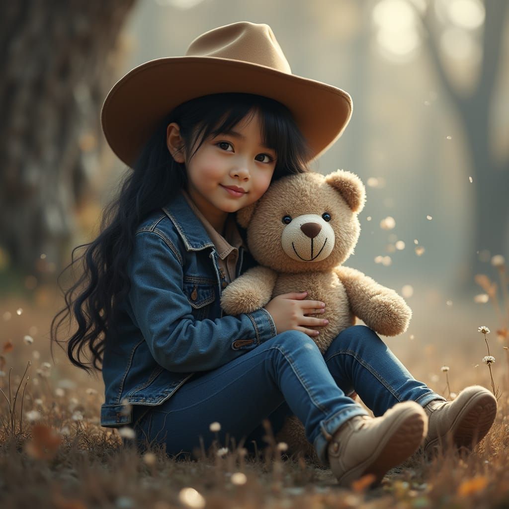 This image shows a little girl in denim attire seated with a teddy bear. The fantasy setting is filled with ethereal mist, soft lighting, and intricate textures, in a cozy, dreamy style.