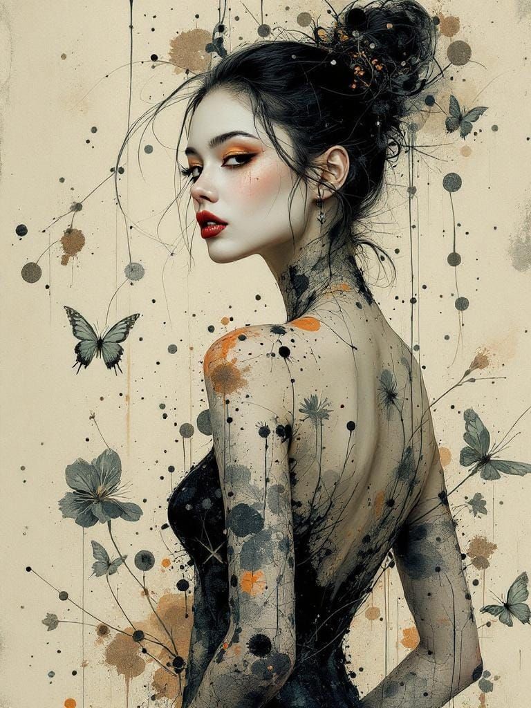 This image shows a woman in profile, glancing over her shoulder with grace. It features ethereal watercolor washes and flowing linework juxtaposed with explosive ink splatters and corroded textures, creating a dreamlike and chaotic aesthetic.