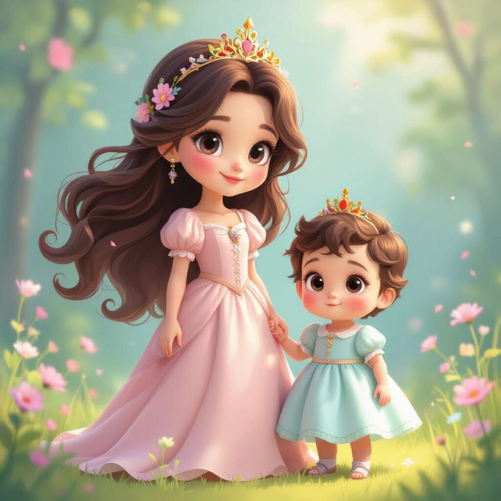 This image features a charming fantasy princess and a baby boy in a pastel dress. Rendered in a vibrant 3D character style with soft cinematic lighting.