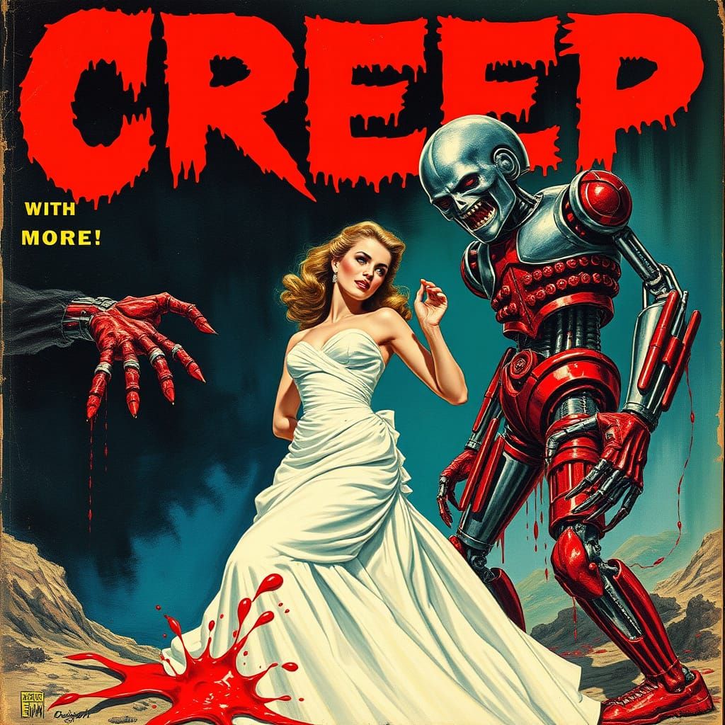 A vintage magazine cover from 1954 depicting a terrified woman being stalked by a robotic man. The artwork features vibrant colors and detailed gouache swirls in a retro science fiction style.