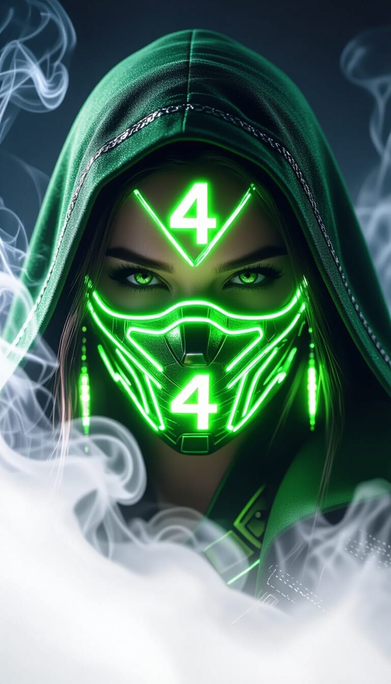 This image showcases a hyper-detailed portrait of a celestial warrior with a glowing neon green mask featuring LED lines and the number "4". The cinematic style emphasizes vibrant lighting and mystical smoke.