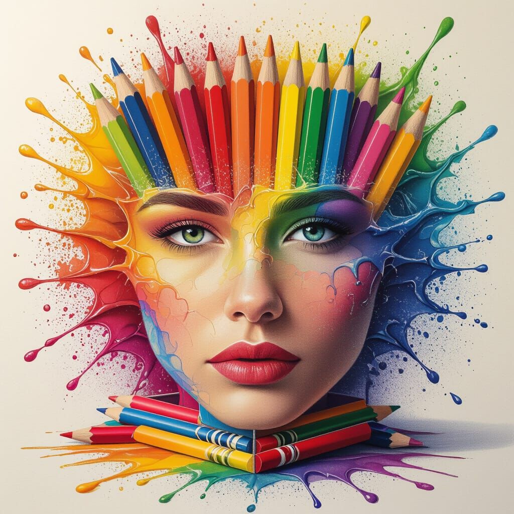 This hyperrealistic image shows sharpened colored pencils transforming into a box of crayons, featuring intricate details and vibrant color depth.