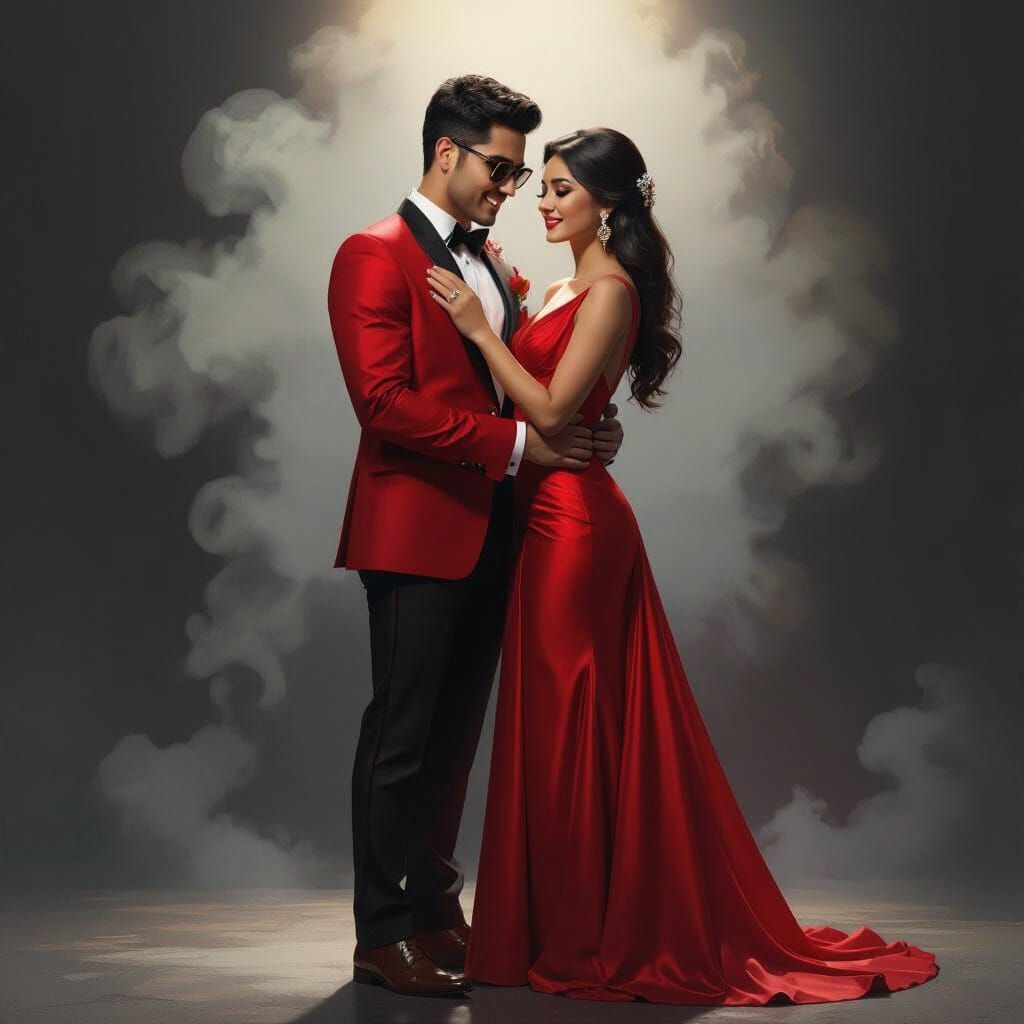 This image shows a stylish young Malay couple embracing in the shadows. The man wears a red tuxedo, while the woman stuns in a long red dress. The piece features cinematic lighting and subtle textures reminiscent of digital painting.
