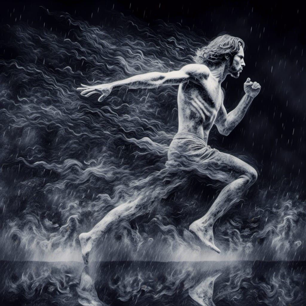 A black and white double exposure image of Jim Morrison dancing in the rain. The watercolor effect and strong contrast create a dramatic, misty atmosphere.