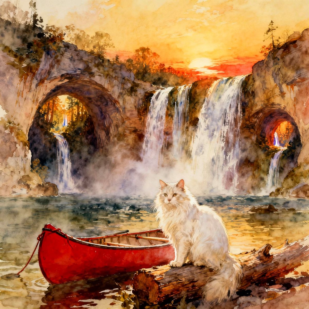 A watercolor painting of a white cat on a log near waterfalls during golden hour. Features arched rock formations, a red canoe, and misty, warm sunlight with visible brushstrokes.